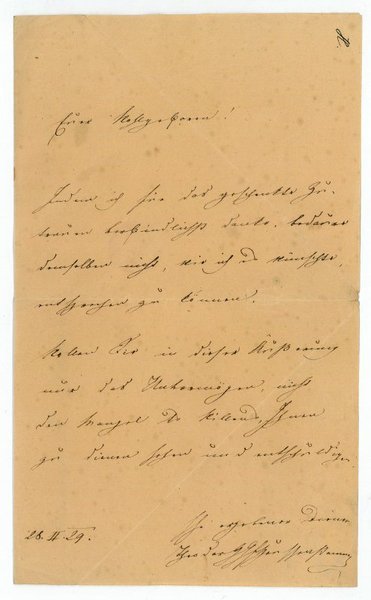 1 S. auf Doppelblatt. 8vo. An einen Herrn d'Adami: "Indem ich für das geschenkte Zutrauen verbindlichst danke, bedaure [ich] demselben nicht, wie ich es wünschte, entsprechen zu können. Wollen Sie in dieser Äußerung nur das Unvermögen, nicht den Mangel des Willens, Ihnen zu dienen sehen und entschuldigen […]". - Der Sohn eines Regierungsrats aus altadligem Geschlecht lebte nach dem Schulbesuch meist auf Reisen in Deutschland, Frankreich und Italien. Er war Freund und Gönner von Künstlern und Schriftstellern, u. a. von Ferdinand Raimund. Heussenstamm zu Heißenstein schrieb Gedichte, Erzählungen, Schauspiele und Romane, u. a. "Schattenrisse aus Giulios Leben" (1832). Seine Gesammelten Werke erschienen postum 1897-1900 in 6 Bänden. - Leicht knittrig und gebräunt sowie mit Siegelresten.