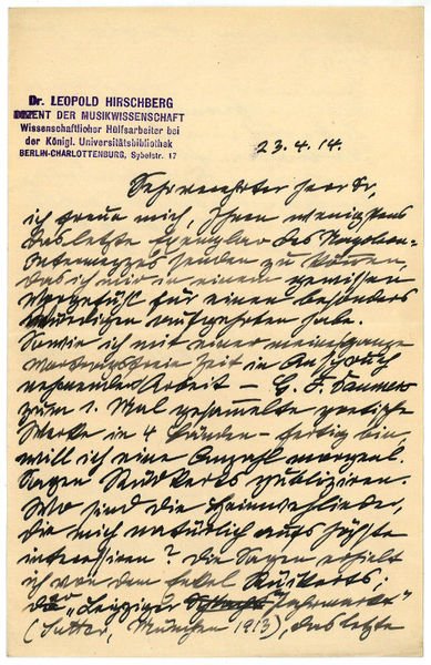 2 SS. auf Doppelblatt. 8vo. [An Franz Othmar Haeller]. - Hirschberg studierte Medizin in Berlin, München, Straßburg und Königsberg, widmete sich daneben musikwissenschaftlichen Studien und wurde 1891 zum Dr. med. promoviert. Anschließend praktizierte er als Arzt in Berlin, wo er seit 1900 auch als Dozent für Musikgeschichte an der Humboldt-Hochschule wirkte. Hirschberg befaßte sich vorwiegend mit Carl Loewe, gab dessen "Geistliche Gesänge" (1905) und "Weltliche Chöre" (3 Bde., 1912) heraus und war 1912-26 Herausgeber der Reihe "Schriften über Musik und Musiker". Darüber hinaus machte sich Hirschberg als Literaturhistoriker einen Namen und gab u. a. "Sämtliche Werke" E. T. A. Hoffmanns (14 Bde., 1922) und den "Taschengoedeke" (1924; überarb. Neuausg. 1970) heraus. 1919 erschienen seine "Erinnerungen eines Bibliophilen". - Mit Adreßstempel.