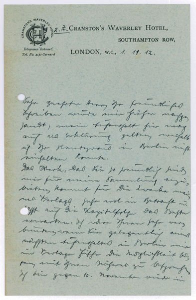 1½ SS. Gr.-8vo. Von einer London-Reise an den Reiseschriftsteller Ewald Banse (1883-1953), der ihm ein Manuskript für eine von Holitscher geplante Reihe angeboten hat: "[.] Das Werk, das Sie so freundlich sind, mir für meine Sammlung anzubieten, kommt für die Zwecke meines Verlags sehr wo[h]l in Betracht u. [lä]sst auch die Kapitelfolge das Beste erwarten. Ich wäre Ihnen sehr verbunden, wenn Sie gelegentlich eines nächsten Aufenthaltes in Berlin mir im Verlage Fischer die Möglichkeit böten, mit Ihnen Näheres zu besprechen [.] Für die Aufforderung zur Mitarbeit an Ihrer Zeitschrift bestens dankend, erkläre ich mich sehr gerne bereit, Geeignetes im gegebenen Falle Ihnen vorzulegen". - Arthur Holitscher hatte in diesem Jahr bei S. Fischer sein Buch "Amerika heute und morgen. Reiseerlebnisse" herausgebracht, das zu einem großen Erfolg wurde, weswegen er nun offenbar eine Serie mit Reisebeschreibungen vor Augen hatte. Bei S. Fischer ist von Banse, der sich später politisch nach rechts außen bewegte, allerdings nichts erschienen. - Auf Briefpapier mit gedr. Briefkopf von "Cranston's Waverley Hotel"; im linken Rand gelocht (geringf. Textberührung); etwas lichtrandig.
