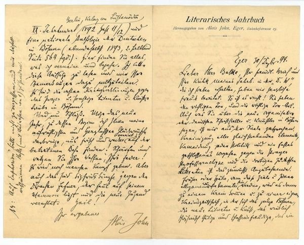 4 SS. auf Doppelblatt. 8vo. An den Musikwissenschaftler Richard Batka: "Ihr freundl. Brief und Ihre Kritik meines Jahrb. in der 'D. W.' die ich soeben erhalten, haben mir herzliche Freude bereitet. So ist es recht! Sie haben den richtigen Ton, und die richtige Ton-Art. Auch was Sie über die neue Organisation der deutschen Schriftsteller u. Künstler in Böhmen sagen, ist mir aus der Seele gesprochen. Vereinigung aller gleichstrebenden Elemente, Vermeidung jeder Politik und ein festes geschlossenes Vorgehen gegen die Prager Professorenclique und die dortigen Jüdischen Literaten ist das zunächst Anzubahnende. Früher oder später, wenn diese Ziele u. Ideen allgemeiner u. bekannter sein werden, wird es dann zu einem Verein kommen u. zu einer eigenen Vereinszeitschrift, in der sich das junge Böhmen, die neue Literatur u. Kunst, das wirklich schöpferisch thätige und schaffensfreudige, das wir haben und das noch zerstreut ohne sich zu kennen im Lande sitzt - groß und bedeutend verbünden wird. Die neue Generation, die jetzt herangewachsen ist, hat sich lange genug von den alten Herrn gängeln lassen […]". - Mit gedr. Briefkopf des "Literarischen Jahrbuchs".