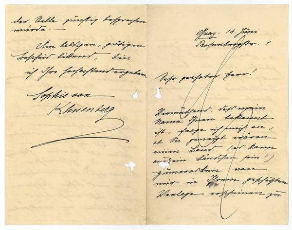 3 ½ SS. auf gefalt. Doppelblatt. 8vo. An einen namentlich nicht genannten Verleger: "Vermuthend, daß mein Mann Ihnen bekannt ist, frage ich mich an, ob Sie geneigt wären einen Band (es kann auch ein Bändchen sein!) Humoresken von mir in Ihrem geschätzten Verlage erscheinen zu lassen? - Es werden ihren 12-15 sein und ich glaube, daß sie, bei entsprechender handlichen Ausstellung und mäßigen Preise eine recht gangbare Reise - und Bade-Lecture abgeben könnten. Ich erlaube mir Ihnen ein paar Proben beizugeben und würde den Titel wählen: ‚Blauer Himmel' Luftige Geschichten von S. v. K. da die kleinen Erzählungen fast ausschließlich im heimatlichen Baden wurzeln, würde ich mich ganz besonders darüber freuen, wenn Sie dieselben annehmen wollten. Ich füge einige Kritiken über meine früher erschienenen Bücher bei […]". - Gelocht. - Khuenberg heiratete 1883 den Schriftsteller und Kunstkritiker Karl Erasmus Kleinert, der auch Redakteur der "Grazer Tageszeitung" war. Sie lebte in Wien, Graz, Brünn und Linz, war Mitarbeiterin der Zeitschrift "Moderne Dichtung" und des Witzblattes "Der liebe Augustin". In zweiter Ehe war sie mit Oberst Valduga verheiratet.