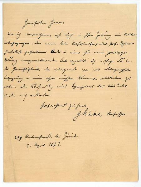 1 S. auf gefalt. Doppelblatt. 8vo. An einen namentlich nicht genannten Adressaten: "Wie ich vernehme, ist auch in Ihre Zeitung ein Artikel übergegangen, der meine beim Abschiedsfest des Prof. Gusserow [?] hieselbst gehaltene Rede in einer für meine politische Stellung compromittierender Art verfasst ist […]". Ersucht den Empfänger, eine von ihm verfasste Version der Rede in einer der kommenden Ausgaben abzudrucken.