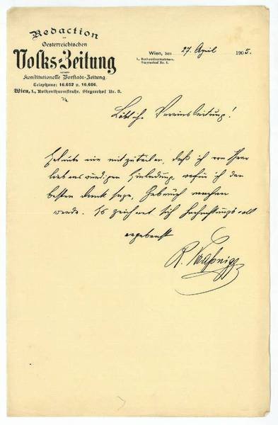 1 S. 8vo. An eine Vereinsleitung: "Erlaube mir mitzuteilen, daß ich von Ihrer liebenswürdigen Einladung, wofür ich den besten Dank sage, Gebrauch machen werde […]". Auf Briefpapier mit gedr. Briefkopf der "Oesterreichischen Volks-Zeitung". - Der Eisenbahner wurde 1885 Mitarbeiter der Zeitschrift Junger Kikeriki. 1887 wurde er Redakteur der Österreichischen Volks-Zeitung.