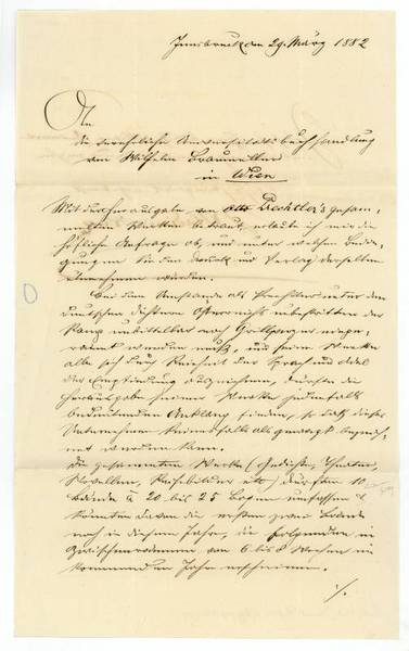 1 ½ SS. Folio. An den Verleger Wilhelm Braumüller (1807-1884): "Mit der Herausgabe von Otto Prechtler's gesammelten Werken betraut, erlaube ich mir die höfliche Anfrage ob, und unter welchen Bedingungen Sie den Druck und Verlag derselben übernehmen würden. Bei dem Umstande als Prechtler unter den deutschen Dichtern Österreichs unbestritten den Rang unmittelbar nach Grillparzer eingeräumt werde muß, und seine Werke alle sich durch Reinheit der Sprach und Adel der Empfindung auszeichnen, dürfte die Herausgabe seiner Werke jedenfalls bedeutenden Anklang finden so daß dieses Unternehmen keinesfalls als gewagt bezeichnet werden kann […]". - Gefaltet.
