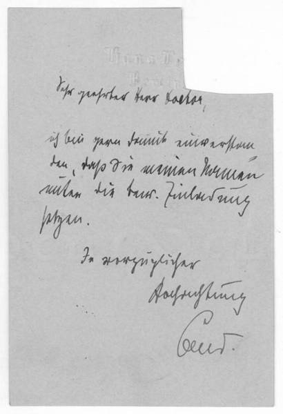 1 S. 8vo. Mit eh. Adresse verso. Ich bin gern damit einverstanden, dass Sie meinen Namen unter die bew. Einladung setzen […]. - Seit 1890 Mitarbeiter der Zeitschrift "Freie Bühne", gründete Land 1898 die Wochenschrift für Politik, Wissenschaft und Kunst "Das neue Jahrhundert", die 1901 wieder eingestellt wurde, und war seit 1905 Redakteur von "Reclams Universum". Land schrieb u.a. den Berliner Roman "Der neue Gott" (1890) und mit Felix -Hollaender das soziale Drama "Die heilige Ehe" (1892). Seine späteren Werke sind vorwiegend dem Unterhaltungsgenre zuzuordnen. - Mit Ausschnitt der Briefmarke.