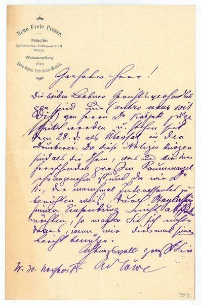 1 S. auf Doppelblatt. 8vo. An einen namentlich nicht genannten Adressaten: "Die beiden Leobner Gerichtsverhandlungen sind uns (entre nous soit dit) von Herrn Dr. Kasjek zuschickt worden u. stehen seit dem 28. d. als Übersatz in der Druckerei. Da diese Notizen kürzer sind als die Ihren, was uns bei dem herrschenden großen Raummangel sehr angenehm ist, und da wir Dr. K., der manchmal Interessantes zu berichten weiß, durch Weglassung seiner Einsendung nicht abschrecken möchten, so machen Sie sich nichts draus, wenn wir diesmal seinen Bericht benützen […]". - Auf Briefpapier mit gedr. Briefkopf der Redaktion der "Neuen Freien Presse".
