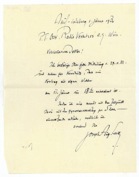 1 S. 4to. An den Schriftsteller Hans Nüchtern (1896-1962), Leiter der literarischen Abteilung der Radio Verkehrs AG (RAVAG): "Ich bestätige Ihre frdl. Mitteilung [.] und nehme zur Kenntnis, dass mein Vortrag aus eigenen Werken am 11. Jänner um 18h anberaumt ist. […]". - Lux war seit 1904 Herausgeber der "Hohen Warte", 1907-10 leitete er die Lehrlingsschule für Kunstgewerbe in der Gartenstadt Hellerau bei Dresden und ließ sich dann in München als freier Schriftsteller nieder.