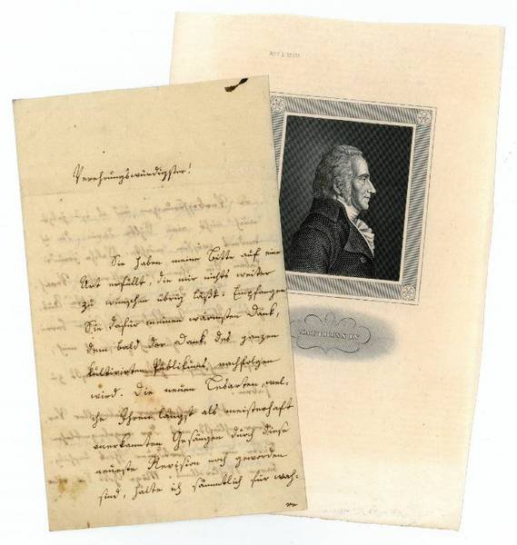 3 SS. auf Doppelblatt. 8vo. Wasserzeichen: Posthorn an Schnur in bekrönter Kartusche (Fragment). Verehrungswürdigster! Sie haben meine Bitte auf eine Art erfüllt, die mir nichts weiter zu wünschen übrig läßt. Empfangen Sie dafür meinen wärmsten Dank, dem bald der Dank des ganzen kultivierten Publikums nachfolgen wird. Die neuen Lesarten, welche Ihren längst als meisterhaft anerkannten Gesängen durch diese neueste Revision noch geworden sind, halte ich sämmtlich für wahre Verbesserungen und es ist jetzt auch nicht eine Sylbe darin, die ich anders wissen möchte. Welche Freude haben Sie Ihren so zahlreichen Verehrern durch diese einzige ächte Ausgabe Ihrer trefflichen Gesänge bereitet und wie glücklich preise ich mich, dieß wahrhaft Gute veranlaßt zu haben! Ihr vieljähriger liebevoller Verehrer schließt mit der angelegentlichen Bitte um die Fortdauer Ihres unschätzbaren Wohlwollens. Möge Gott Sie, edler und weiser Thäter des Guten, noch lange, lange zum Glücke Ihrer Freunde und zum Segen des dankbaren Vaterlandes erhalten! Niemand wird sich der Erfüllung dieses gerechten Wunsches mit wärmerer Theilnehmung freuen, als Ihr hochachtungsvoller Matthisson. - Beiliegend ein Stahlstichportrait des Dichters.
