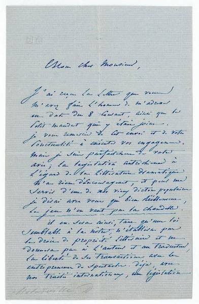 2 SS. auf Doppelblatt. 8vo. In französischer Sprache an einen namentlich nicht genannten Adressaten. - Auf Briefpapier mit gepr. Monogramm "DM".