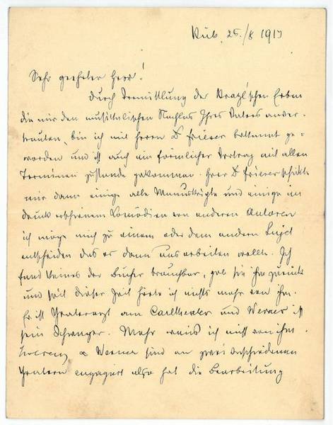 2 SS. auf Doppelblatt. 8vo. An einen namentlich nicht genannten Adressaten: "Durch Vermittlung der Kratzl'schen Erben die mir den musikalischen Nachlas [!] Ihres Vaters anvertrauten, bin ich mit Herrn D. Frieser bekannt geworden und ist auch ein förmlicher Vertrag mit allen Terminen zustande gekommen. Herr D. Frieser schickte mir dann einige alte Manuskripte und einige im Druck erschienene Komödien von anderen Autoren ich möge mich zu einem oder dem andern Sujet entscheiden das er dann ausarbeiten wolle. Ich fand keines der Bücher brauchbar [.]". - Paul Mestrozi war Kapellmeister des Theaters in der Josefstadt und Mitglied des Hofburgtheater-Orchesters sowie der Hofkapelle. Später Eigentümer und Direktor des Fürst-Theaters im Prater und Leiter des Theaters in Wiener Neustadt, verfaßte bzw. komponierte Mestrozi neben zahlreichen Sprechstücken humoristischer Art auch Märsche, Walzer, Chöre u. a. Vgl. Eisenberg, Das geistige Wien, s. v.