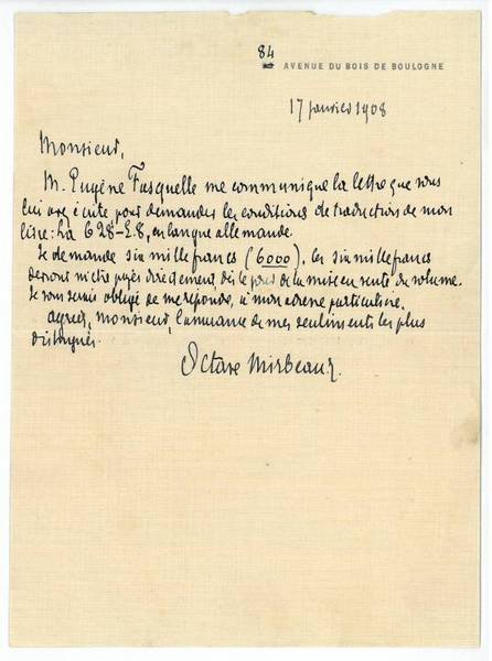1 S. 8vo. Auf Briefpapier mit gedr. Adressbriefkopf. Beiliegend der eh. adressierte Briefumschlag. An Fritz Freund (1879-1950), Leiter des "Wiener Verlags": "Monsieur, M. Eugène Fasquelle me communique la lettre que vous lui avez écrite pour demander les conditions de traductions de mon livre: La 628-E.8, en langue allemande. Je demande six mille francs (6000), les six mille francs devront m'être payer directement, dès le pret de la mise en vente de volume. Je vous serais obligé de me répondre, à mon adresse particulière [.]". Der in gesellschaftskritischer Avantgarde wie in Schlüpfrigkeiten furchtlose "Wiener Verlag" hatte seit 1901 zahlreiche Werke Mirbeaus ins Deutsche gebracht; 1908 erschien allerdings nur mehr eine Neuausgabe seines großen Sittenromans "Tagebuch einer Kammerjungfer".