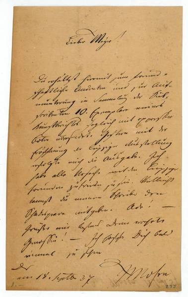 1 S. 8vo. Übersendet einem Freund "als Andenken und zur Aufmunterung" einen von ihm verfassten Kunstbericht. "Gestern mit der Eröffnung der Leipziger Ausstellung erfolgte auch die Ausgabe. Ich habe alle Ursache mit den Leipziger Freunden zufrieden zu sein […]". - Gefaltet. - Nach dem Studium der Philosophie und der Rechtswissenschaften ließ Mosen sich als Advokat in Leipzig nieder, wurde 1831 Gerichtsaktuar und 1834 selbständiger Anwalt in Dresden, wo er sich mit Ludwig Tieck, Ernst Theodor Echtermeyer, Arnold Ruge und Gottfried Semper befreundete. 1844 wurde Mosen Dramaturg am Großherzoglichen Hoftheater in Oldenburg, 1846 begann er unter stetig anwachsenden Lähmungserscheinungen zu leiden, die schlußends zu Unbeweglichkeit und zum Verlust der Sprache führten.