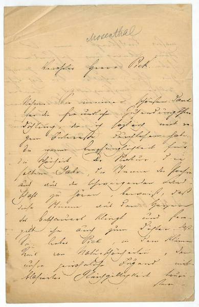 2 SS. auf gefalt. Doppelblatt. 8vo. Nehmen Sie meinen schönsten Dank für die freundliche Zusendung Ihrer Dichtung, die ich folglich mit regem Interesse durchgelesen habe. Die warme Empfänglichkeit für die Schönheit der Natur, die seltene Gabe, die Stimme der Poesie auch aus der schweigenden Landschaft zu hören, beweist, daß diese Stimme aus dem Herzen des Beschauers klingt und stempelt ihn auch zum Dichter. Daß Sie lieber Pick, in dem kleinen Kreis von Naturschönheiten, den unsre gewöhnliche Jugend mit blasierter Gleichgültigkeit touristenmäßig durchfliegt, eine so schöne Anregung gefunden haben, gereicht Ihnen gewiß zur Ehre; erhalten Sie sich diese poetische Empfänglichkeit, lieber Freund […]. - Der aus einer jüdischen Kaufmannsfamilie stammende Schriftsteller studierte Naturwissenschaften am Karlsruher Polytechnikum, promovierte 1842 und war seit 1843 Hauslehrer und Erzieher in Wien. "Daneben widmete er sich literarischen Studien, erhielt 1850 eine Beamtenstelle im Ministerium für Unterricht und Kultus und übernahm 1864 den Vorstand der Ministeriumsbibliothek. Mosenthal schrieb Libretti zu Opern von Otto Nicolai, Friedrich von Flotow und Heinrich August Marschner sowie Lyrik und Dramen. Mit seinem Stück ‚Deborah' (1850) fand er nach der Uraufführung in Hamburg internationale Beachtung (u. a. 1862 400 Aufführungen in Folge in New York)" (DBE).
