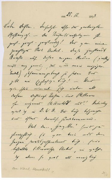 2 SS. Gr.-schmal-8vo. An den Dichter und Schriftsteller Karl Henckell über dessen Anthologie "Buch der Freiheit": "[.] Die Freiheitsanthologie ist groß - groß - großartig! Das war ein gewaltiges Stück Arbeit. Diese zerstreuten Kräfte auf diesem engen Raum (vielleicht nicht eng genug, das wäre mein einziger Tadel) zusammengebracht zu haben, das gibt ein Explosiv-Buch! - Und wie schön nimmt sich unter all diesen Dichtungs Fürsten- und Rittern ihr eigenes Ritterlied aus! Natürlich werd ich [.] das Buch besprechen [.] Mit dem 'Gewitter' sind [Sie] zu glimpflich. Es war kein aus dem Herzen herausgeschriebenes Buch. Eine bestellte litterarische Arbeit, in welcher ich eben so viel als möglich etwas von den Saiten erklingen ließ die auch bei Ihnen nachgeklungen haben, aber nichts Gewaltiges ist drin [.]". - Im Mittelfalz alt hinterlegt, am linken Rand etwas knapp und unregelmäßig beschnitten.