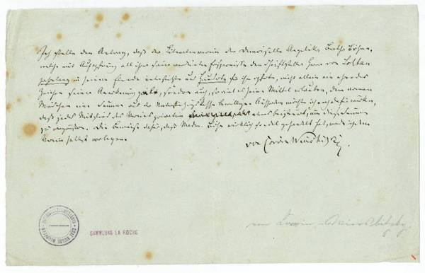 1 S. Qu.-8vo. Ich stelle den Antrag, daß der Literaturverein der Demoiselle Angelika Bertha Bösen, welche mit Aufopferung all ihrer sauer verdienten Ersparnisse den Schriftsteller Herrn von Loltan jahrelang in seinem Elende unterstützte und Hunderte für ihn opferte, nicht allein ein ehrendes Zeichen seiner Anerkennung giebt, sondern auch, so viel es seine Mittel erlauben, dem armen Mädchen eine Summe aus der Unterstützungskassa bewillige. Ausserdem möchte ich noch dafür wirken, daß jedes Mitglied des Vereins privatim etwas beisteuert, um diese Summe zu vergrößern. Die Beweise dafür, daß Mdm. Böse wirklich so edel gehandelt hat, werde ich dem Verein selbst vorlegen […]. - Fleckig. - Mit Sammlerstempel "Graf Victor Wimpffen. Handschriftensammlung" sowie "Sammlung La Roche". - Corvin-Wiersbitzki stammte aus polnisch-westpreußischem Adel, genoss eine Kadettenerziehung und war mit 18 Jahren Leutnant in einer Mainzer Garnison. Nach frühzeitigem Ausscheiden aus der Armee ließ er sich als Journalist und Gelegenheitsschriftsteller in Leipzig nieder, schloss sich dort liberaldemokratischen und antiklerikalen Kreisen an und führte 1848 die Revolution im Elsaß sowie am Oberrhein an. 1849 wurde er verhaftet, zum Tod verurteilt und schließlich zu sechs Jahren Zuchthaus begnadigt. Nach seiner Entlassung 1855 berichtete er als freier Mitarbeiter für renommierte Blätter wie "Times", "New York Times", "Augsburger Allgemeine Zeitung" und Charles Dickens' "Household Words" aus Amerika, England und Deutschland.