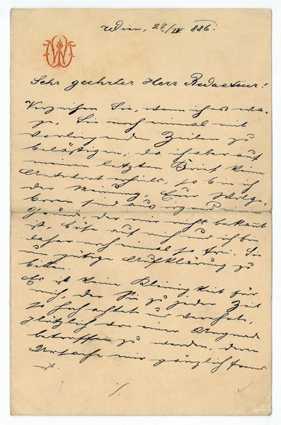 3 SS. 8vo. An einen namentlich nicht genannten Redakteur: "Verzeihen Sie, wenn ich es wage, Sie noch einmal mit vorliegenden Zeilen zu belästigen, da ich aber auf meinen letzten Brief keine Antwort erhielt, so bin ich der Meinung, Euer Wohlgeboren sind aus irgendeinem Grund, der mir nicht bekannt ist, böse auf mich und ich bin daher noch einmal so frei, Sie um gütige Aufklärung zu bitten. Es ist keine Kleinigkeit für mich, der Sie zu jeder Zeit so hoch achtete und verehrte, plötzlich von einer Ungnade betroffen zu werden, deren Ursache mir gänzlich fremd ist […]". - Auf Briefpapier mit gepr. Initialen. - Wilhelm Wiesberg spielte in Kinderkomödien im Wiener Theater in der Josefstadt und war Mitarbeiter der Zeitschriften Figaro, Kikeriki, Zeitgeist und Der Floh. Nachdem er seine Stellung nach dem Börsenkrach 1873 verloren hatte, wurde er Volkssänger. - Knittrig und stockfleckig.