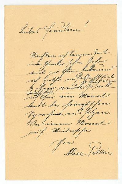 1 S. 8vo. auf Doppelblatt. An eine namentlich nicht genannte Adressatin: "Nachdem ich längere Zeit im Theater schon sehr viel zu thun habe und ich jetzt auf Gastspiele gehen werde, so leid es mir auch thut, so will ich für ein Monat mit der französischen Sprache aussetzen […]".