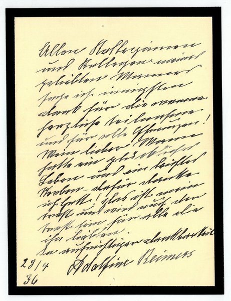 1 S. 8vo. Die Gattin des 1936 verstorbenen Georg Reimers (geb. 1860) bedankt sich für die Anteilnahme.