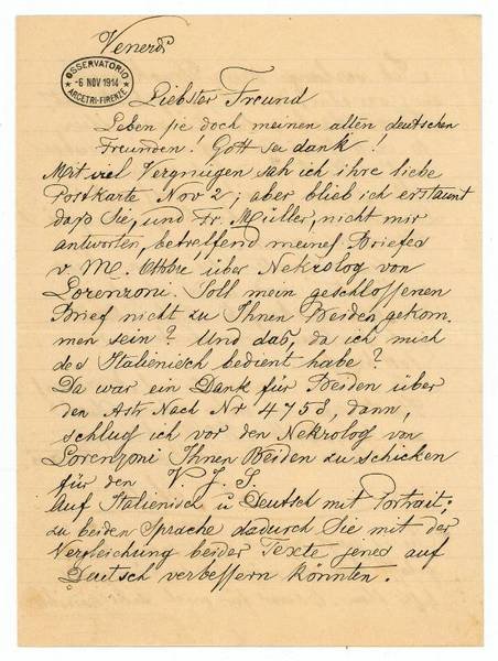 2¼ SS. auf Doppelblatt. Kl.-4to. An einen namentlich nicht genannten Adressaten: "Leben sie doch, meine alten deutschen Freunden! Gott sei dank! Mit viel Vergnügen sah ich ihre liebe Postkarte Nov 2; aber blieb ich erstaunt daß sie, und Fr. Müller, nicht mir antworten, betreffend meines Briefes v. Mt. Ottobre über Nekrolog von Lorenzoni. Soll mein geschlossenen Brief nicht zu Ihnen Beiden gelangt sein! Und das, da ich mich des Italienisch bedient habe? [.]". - Antonio Abetti arbeitete vorwiegend über die Bestimmung der Position von Himmelskörpern, führte zahlreiche Beobachtungen von Kleinplaneten (Asteroiden), Kometen und Sternbedeckungen durch und beobachtete während einer Expedition nach Muddapur, (heute Madhupur in Jharkhand, Bengalen) den Venustransit von 1874 mittels eines Spektroskops. - Mit gestemp. Briefkopf.