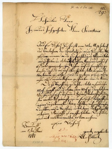 1 S. Gr.-4to. Hochedeler Herr, Insonders Hochgeehrter Herr Secretair / Aus Ew. Hoched. Zuschrift vom 30ten M. p. habe ich das Conclusum der Societaet, das auser derselben Mitglieder, niemand an die zur Errichtung der Bleyweis Fabric auszutheilenden Actien Theil nehmen kann, und welches ich bis dato ignoriret, ersehen: Dahero auch die Einrichtung getroffen, daß die an mich überschickete Actie, benandten Umständen zu folge, so wie die ersteren beyde, nunmehr auf meinem Nahmen geschrieben werden kann. Die zu Bezahlung gedachter Actie erforderlichen 10 rth., sowohl als die Summe derer 30 rth. zu derer letzteren Vorschuß ich mich durch meines Nahmens Unterschrift jüngstin verbündlich gemacht, werden Ew. Hoched. beygeschloßen in einer unzertrenneten Summe erhalten, auch nach Empfang derselben, mich in Ansehung der letzteren Post gelegentlich mit einem Recipisse zu versehen belieben [.]. - Mit Quittungsvermerk in roter Tinte am Fußende. Gefaltet; im Rand teils leicht gebräunt.