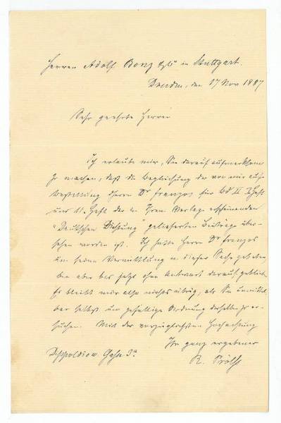 1 S. 8vo. An den Verlag Adolf Bong in Stuttgart: "Ich erlaube mir, Sie darauf aufmerksam zu machen, daß die Begleichung der von mir auf Bestellung d. Herrn Dr. Franzos für Bd. II I. Heft und 11. [?] Heft der in Ihrem Verlage erscheinenden 'Deutschen Dichtung' gelieferten Beiträge übersehen worden ist [.]". - Robert Proelss war viele Jahre als Theaterkritiker für die "Dresdner Zeitung" tätig, "seine Berichte galten als die gediegensten unter allen, die damals in Dresden erschienen. Er schrieb aber auch eigene Theaterstücke, Biografien bedeutender Persönlichkeiten (Heinrich Heine, Königin Marie Antoinette) sowie Beiträge zur Geschichte des Theaters, darunter des Hoftheaters in Dresden" (Stadtwiki Dresden).