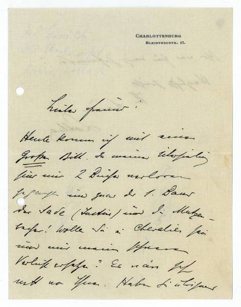 2 SS. auf Doppelblatt. 8vo. An einen Freund: "Heute komme ich mit einer großen Bitte. In meiner Übersiedlung sind mir 2 Bücher verloren gegangen und zwar der 1. Band des Sade (Justine) und die Mutzenbacher. Wollen Sie ein Chevalier sein und mir meine schweren Verluste ersetzen? Es wäre sehr nett von Ihnen. Haben Sie übrigens schon was für mich gefunden? […]". - Lothar war bis 1907 Mitarbeiter der "Neuen Freien Presse" in Wien, anschließend des "Lokal-Anzeigers" in Berlin, wo er 1912 das Komödienhaus gründete. Nach längeren Reisen, die ihn u.a. nach Spanien, Palästina und in die USA führten, kehrte er 1933 nach Wien zurück und war Theaterkritiker des "Neuen Wiener Journals", bis er 1938 in seine ungarische Heimat zurückkehrte. - Auf Briefpapier mit gedr. Adresse. Am linken Rand gelocht.