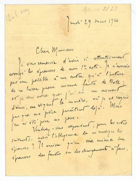 2 SS. auf Doppelblatt. 8vo. In französischer Sprache an an einen namentlich nicht genannten Adressaten.