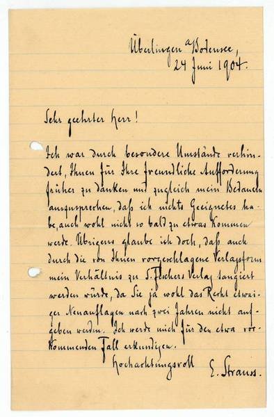 1 S. auf gefalt. Doppelblatt. 8vo. An einen namentlich nicht genannten Verleger: "Ich war durch besondere Umstände verhindert, Ihnen für Ihre freundliche Aufforderung früher zu danken und zugleich mein Bedauern auszusprechen, daß ich nichts Geeignetes habe, auch wohl nicht so bald zu etwas kommen werde. Übrigens glaube ich doch, daß auch durch die von Ihnen vorgeschlagene Verlagsform mein Verhältnis zu S. Fischers Verlag tangiert werden würde, da Sie ja wohl das Recht etwaiger Neuauflagen nach zwei Jahren nicht aufgeben werden. Ich werde mich für den etwa vorkommenden Fall erkundigen […]". - Am linken Rand gelocht. - Mitglied des Friedrichshagener Dichterkreises, dem u. a. auch Max Halbe, Richard Dehmel und Gerhart Hauptmann angehörten, beschäftigte sich Strauß mit landwirtschaftlich-lebensreformerischen Experimenten, ging längere Zeit auf Reisen (u. a. nach Brasilien, wo er ein Internat leitete) und lebte seit 1894, mit Unterbrechung durch einen vierjährigen Aufenthalt in der Dresdner Künstlerkolonie Hellerau, in Süddeutschland. Mitglied der Sektion für Dichtkunst der Preußischen Akademie der Künste und seit 1930 Mitglied der NSDAP, sind seine Werke von einer neuromantischen Harmonisierung des Volkslebens und von Traditionsbewußtsein bestimmt; gelegentlich auch völkische Tendenzen aufweisend, erreichten sie während des Dritten Reichs hohe Auflagen. Vgl. Kosch XX, 569ff.