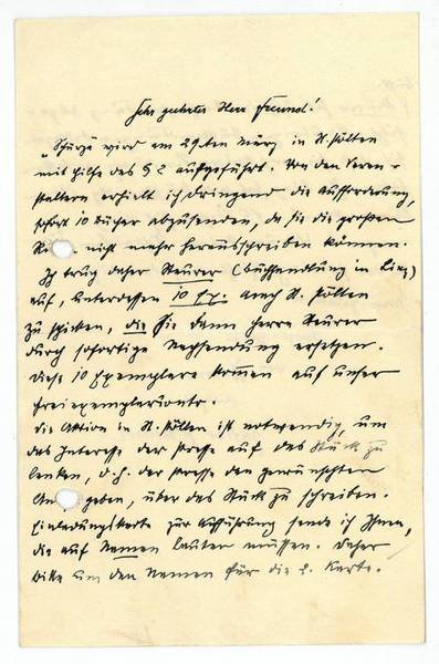 1 ½ SS. auf gefalt. Doppelblatt. 8vo. An einen namentlich nicht genannten Adressaten bezüglich der Aufführung seines Werkes ‚Die Schürze' in St. Pölten. "Die Aktion in St. Pölten ist notwendig, um das Interesse der Presse auf das Stück zu lenken […]". - Am linken Rand gelocht (geringer Textverlust).