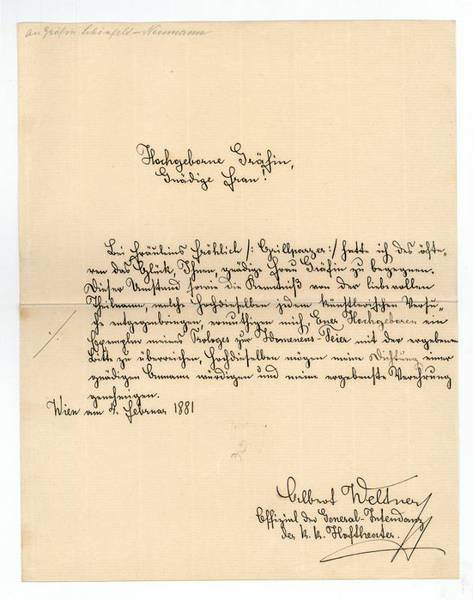 1 S. auf Doppelblatt. Gr.-4to. Wie von alter Hand in Bleistift vermerkt, an Louise Gräfin von Schönfeld-Neumann (1818-1905): "Bei Fräuleins Fröhlch (Grillparzer) hatte ich des öfteren das Glück, Ihnen, gnädige Frau Gräfin[,] zu begegnen. Dieser Umstand sowie die Kenntniß von der liebevollen Theilnahme, welche Hochdieselben jedem künstlerischen Versuche entgegenbringen, ermuthigen mich, Euer Hochgeboren ein Exemplar meines Prologes zur Idomeneus-Feier mit der ergebenen Bitte zu überreichen, Hochdieselben mögen meine Dichtung einer gnädigen Anna[h]me würdigen [.]".
