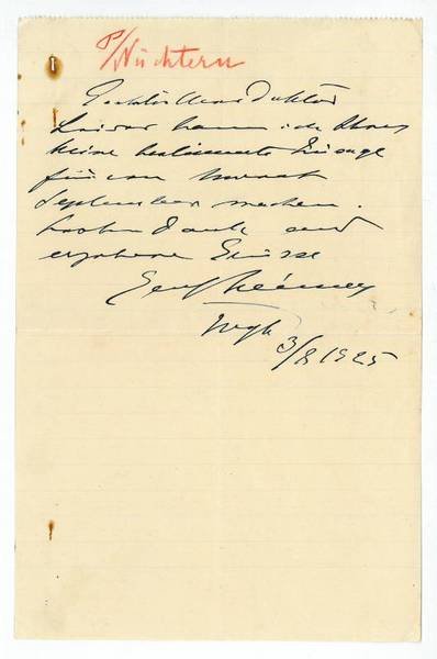 ½ S. 8vo. Mit eh. adr. Kuvert. An den namentlich nicht genannten Journalisten, Dramaturgen und damaligen Leiter der literarischen Abteilung der RAVAG Hans Nüchtern (1896-1962): "Leider kann ich Ihnen keine bestimmte Zusage für den Monat September machen [.]". - Etwas rostfleckig durch Stecknadeldurchstich.