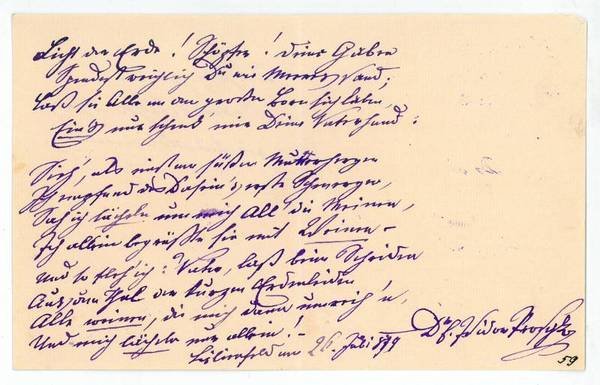 2 SS. auf Doppelblatt, 8vo (Brief) sowie 1 S. Qu.-8vo (Albumblatt), letzteres umseitig mit einer halbseitigen Widmung. An den Grazer Autographensammler Alexander Hesse mit dem Versprechen, diesem einige Autographen von Schriftstellern zu beschaffen, sowie einem eigenh. Gedicht für dessen Sammlung: "Licht der Erde! Schöpfer! Deine Gaben | Spendest reichlich Du wie Meeressand; | Laß Sie Alle an dem großen Born sich laben, | Ein's nur schenk' mir[,] Deine Vaterhand [.]". - Der u. a. mit Adalbert Stifter befreundete Franz Isidor Proschko schrieb Erzählungen, Romane, Gedichte und Dramen mit meist historischer Thematik und trat auch als Jugendschriftsteller hervor. 1876-84 erschienen seine "Österreichischen Volks- und Jugendschriften zur Hebung der Vaterlandsliebe".