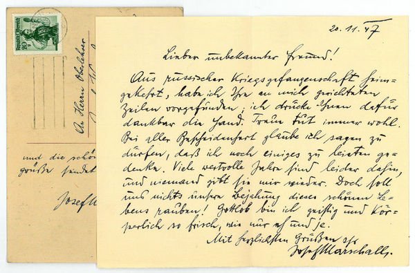 Zusammen 2 SS. Qu.-8vo. Mit einem eh. adr. Kuvert. Dankt Josef Wesely für ihm übersandte Geburtstagswünsche: “Aus russischer Kriegsgefangenschaft heimgekehrt, habe ich Ihre an mich gerichteten Zeilen vorgefunden; ich drücke Ihnen dafür dankbar die Hand. Treue tut immer wohl. Bei aller Bescheidenheit glaube ich sagen zu dürfen, daß ich noch einiges zu leisten gedenke. Viele wertvolle Jahre sind leider dahin, und niemand gibt sie mir wieder [.]”. - Marschall war als Erzähler, Lyriker, Archäologe und Bibliothekar tätig. Seine Romane und Erzählungen schildern vorwiegend die dörfliche Welt des Burgenlandes. Vgl. Giebisch-G. 332 und Kosch X, 471f.