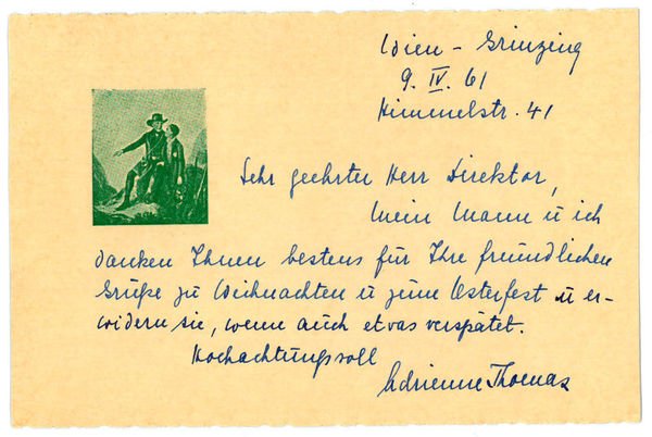 1 S. Qu.-8vo. Mit eh. adr. Kuvert. Dankt Josef Wesely für ihr übersandte Wünsche zu Neujahr und Ostern. - Die in Elsaß-Lothringen geborene Schriftstellerin und Übersetzerin verbrachte - unterbrochen von 37 Vortragsreisen nach Palästina - die Jahre von 1934 bis 38 in Wien; 1938 emigrierte sie nach Frankreich, Spanien und Portugal, 1940 in die USA; 1947 kehrte sie wieder nach Wien zurück, wo sie neben ihrer schriftstellerischen Tätigkeit u. a. als Vorstandsmitglied der österreichischen Sektion des P.E.N.-Club tätig war. Ihr erster, 1930 erschienener, eigene Erlebnisse während ihrer Zeit als Krankenschwester aufarbeitender Liebesroman aus der Zeit des Ersten Weltkriegs ‘Die Katrin wird Soldat’ avancierte zum Welterfolg und erreichte - in 15 Sprachen übersetzt - eine Gesamtauflage von über 15 Mio. Exemplaren. Vgl. Kosch XXII, 459ff. - Die Karte mit kleiner gedruckter Vignette.