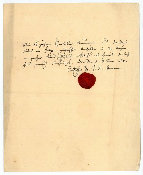 ½ SS. auf Doppelblatt. 4to. Die 36jährige Charlotte Neumaier aus Dresden leidet in Folge gichtischer Anfälle in den Augen an großer Blödsichtigkeit [.]. - Friedrich August von Ammon war in Dresden am Augenhospital und am Blindeninstitut tätig und wurde dort 1828 Professor der allgemeinen Pathologie, Materia medica, Polyklinik und Direktor der chirurgisch-medizinischen Akademie; 1837 wurde er Leibarzt König Friedrich Augusts II. von Sachsen. "Ammon gehört zu den bedeutenden deutschen Chirurgo-Ophthalmologen in der ersten Hälfte des 19. Jahrhunderts. Er erwarb sich Verdienste um die plastische Chirurgie, ebensosehr durch kritische Darstellung wie durch Angabe neuer Verfahren. Bedeutend war er jedoch vor allem als Augenarzt; er bemühte sich, die Augenheilkunde auf ein genaues Studium der normalen und pathologischen Anatomie zu gründen" (NDB). - Mit gepr. Rundsiegel.