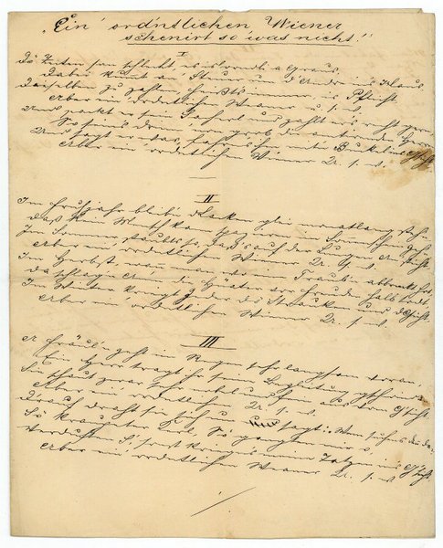 3 SS. 4to. 7 Strophen, betitelt "Ein' ord'ntlichen Wiener schenirt so was nicht!". - Wilhelm Wiesberg spielte in Kinderkomödien im Wiener Theater in der Josefstadt und war Mitarbeiter der Zeitschriften Figaro, Kikeriki, Zeitgeist und Der Floh. Nachdem er seine Stellung nach dem Börsenkrach 1873 verloren hatte, wurde er Volkssänger. - Etwas braunfleckig.