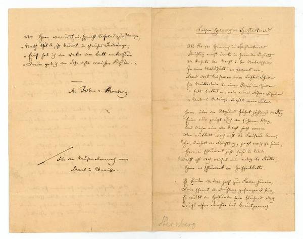 3½ SS. auf gefalt. Doppelblatt. 8vo. 8 strophiges Gedicht "für den Musenalmanach von Schwab und Chamisso": "Als Kaiser Heinrich im Spessartwald / Flüchtig einst irrte in fremder Gestalt, / Da kehrte bei Nacht u. bei Nebelschein / in eine Waldhütt' er zagend ein, / Fand dort beisammen beim Lichtes Schimmer / Ein Mütterlein u. einen Greis im Zimmer / ‚Eilt, bittet er, mir einen Führer zu geben. / Uebers Gebirge, es gilt mein Leben' […]". - Der "Deutsche Musenalmanach" wurde 1833 von Adelbert von Chamisso und Gustav Schwab übernommen und erschien bis 1841. - Der aus einem alten baltischen Adelsgeschlecht stammende Ungern-Sternberg wuchs in einer von der Herrnhuter Brüdergemeine geprägten Umgebung auf, studierte seit 1826 Kameralwissenschaften in Dorpat und erhielt 1830 in St. Petersburg von der Zarin Alexandra ein Stipendium zur Ausbildung als Maler. Vor der Cholera zunächst nach Dresden geflohen, hielt er sich 1831-34 am Hof der Großherzogin Stephanie von Baden in Mannheim auf und wandte sich nach dem Erfolg seiner ersten Novelle "Die Zerissenen" (1832) der Schriftstellerei zu. 1834-41 lebte Ungern-Sternberg in Weimar, ging dann nach Berlin, wo er u.a. im Kreis um Karl August Varnhagen von Ense verkehrte, und arbeitete zeitweise auch als Korrespondent der "Kreuzzeitung". Im Auftrag des russischen Gesandten war Ungern-Sternberg Berichterstatter bei der Frankfurter Nationalversammlung und beim Erfurter Parlament, lebte seit 1850 in Dresden und starb auf dem Gut seines Schwagers.