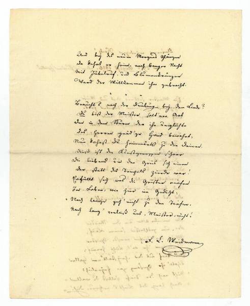 2 SS. 4to. Unserem würdigen Koch! | am 29ten August 1826 | Ein Meister selt'ner Art und Weise | Zog einst von seinen Trauten fort, | Auf eine lange ferne Reise | Nach einem weitentfernten Ort. | Ein leichtes Schiff trug den Geliebten | Hinab den Strom mit sanften Zug; | Doch kaum war er hinweg so trübten | Die Wolken sich im dunklen Flug. | Die Stürme brausten und, die Wogen | Zerschellten wild des Greises Schiff, | Und brandend ward's hinabgezogen, | In das verborg'ne Felsenriff [.].