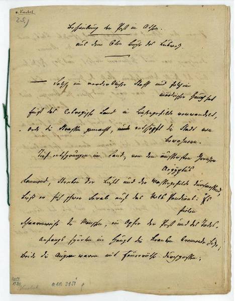 10 SS. 4to. Geheftet. Beschreibung der Pest in Athen aus dem 6ten Buche des Lukrez. - Nach einer humanistischen Schulbildung studierte Knebel Jura in Halle und trat 1765 in das Regiment des Prinzen von Preußen in Potsdam ein. 1773 quittierte er den Militärdienst und wirkte 1774-80 als Erzieher der Prinzen Constantin und Karl August in Weimar. 1774 lernte er Goethe kennen; er war einer der ersten engen Freunde Goethes in Weimar und wurde von diesem als "Urfreund" bezeichnet. Seit 1780 lebte er, inzwischen Major, aber ohne dienstliche Verpflichtungen, abwechselnd in Ansbach, Jena und Weimar, nach der Heirat mit der Sängerin Luise von Rudorf in Ilmenau und seit 1805 endgültig in Jena. Knebel übersetzte aus dem Lateinischen und Italienischen, übertrug u.a. "Die Natur der Dinge" von Lukrez, und verfasste Gedichte sowie Epigramme, darunter "Lebensblüthen" (1826).