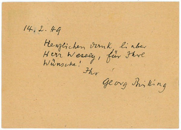 1 S. Qu.-8vo. Mit eh. Adresse. An Josef Wesely: "Herzlichen Dank, lieber Herr Wesely, für Ihre Wünsche! Ihr Georg Britting". - Als Offizier im Ersten Weltkrieg schwer verwundet, war Britting nach Kriegsende als Mitglied des revolutionären Arbeiter- und Soldatenrats und nebenbei als Theaterkritiker tätig. 1919 gründete er zusammen mit dem Maler Josef Achmann die spätexpressionistische Literatur- und Kunstzeitschrift ‘Die Sichel’. Seit 1921 als freier Schriftsteller in München lebend, war er u. a. Mitglied des Dichterstammtisches "Unter den Fischen", zu dem u. a. Paul Alverdes, Eugen Roth und Carl Hanser gehörten. Vgl. Kosch II, 66f.