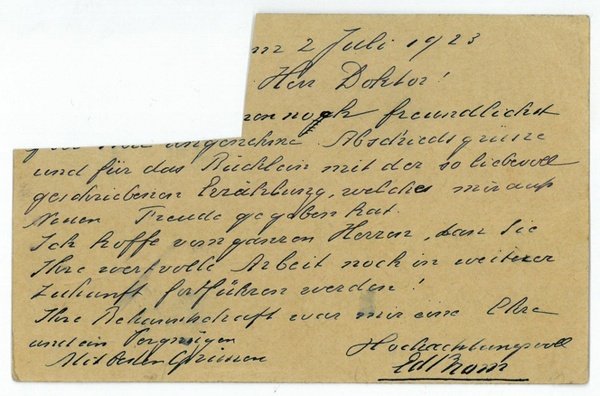 1 S. Qu.-8vo. Mit eh. Adresse. An den Journalisten und Dramaturgen Hans Nüchtern mit Dank für dessen "Abschiedsgrüsse und für das Büchlein mit der so liebevoll geschriebenen Erzählung". - Der aus Wien stammende Journalist und Dramaturg Hans Nüchtern (1896-1962) war seit 1924 Leiter der literarischen Abteilung der RAVAG und unterrichtete auch an der Akademie für Musik und darstellende Kunst sowie am Max Reinhardt-Seminar. Albert Schnerich war von 1911 bis 1922 Oberbibliothekar der Wiener Universitätsbibliothek und betreute die Referate Kunstgeschichte und Musikwissenschaft. - Mit ausgeschnittener Briefmarke (dadurch Textverlust auf der Textseite).