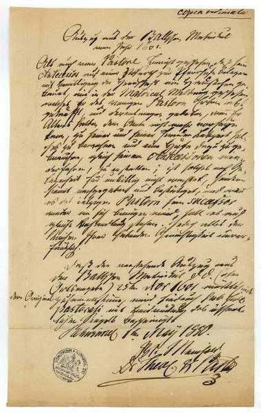 1 S. Folio. Ein "Auszug aus der Ballschen Matrikel vom Jahr 1601". - Johann Wilhelm Meinhold studierte Theologie, Philosophie und Philologie in Greifswald und wurde, erhielt - nach Abbruch seines Studiums durch die Würdigung eines seiner Manuskripte durch Jean Paul - eine Pfarrstelle in Koserow auf Usedom. Später als Pfarrer in Kummin bei Wolgast, setzte Meinhold seine schriftstellerische Tätigkeit fort. "Der dem historischen Realismus verpflichtete Erzähler, Lyriker und Dramatiker erzielte seinen größten Erfolg mit dem Roman Maria Schweidler, die Bernsteinhexe (1843)" (DBE). - Leicht gebräunt.