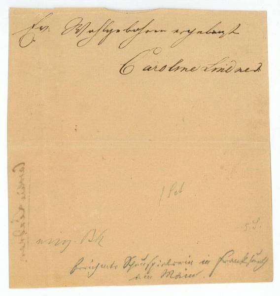 Ca. 125:134 mm. Caroline Lindner spielte im Fach der sentimentalen und munteren Naiven in Konversationsstücken, Lustspielen und bürgerlichen Trauerspielen. Gastspiele führten sie nach Hannover, München, an das Wiener Burgtheater, nach Stuttgart, Karlsruhe und Hamburg. "Als eine der vielseitigsten und bedeutendsten deutschen Schauspielerinnen ihrer Zeit wurde sie u.a. durch ihre Nachahmung des Komikers Anton Hasenhut sowie in Frankfurt durch ihre Interpretation hessischer Mundartrollen berühmt" (DBE).
