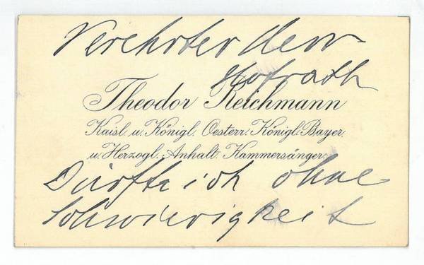 2 SS. Visitkartenformat. An einen namentlich nicht genannten Hofrat: "Dürfte ich ohne Schwierigkeit noch [um] einen Sitz für Gaar bitten?" - Theodor Reichmann gehörte nach Engagements in Berlin, Rotterdam, Köln, Straßburg, Hamburg und München von 1883-89 und von 1893-1903 dem Ensemble der Wiener Hofoper an; zwischenzeitlich wirkte er an der Kroll-Oper in Berlin (1889-91). Als Bariton "einer der bedeutendsten Wagner-Interpreten seiner Zeit" (DBE), sang er zwanzig Jahre lang regelmäßig bei den Bayreuther Festspielen. Gastspielreisen führten ihn u. a. an die Covent Garden Opera in London, an die Metropolitan Opera in New York und an die Kaiserliche Hofoper in St. Petersburg.