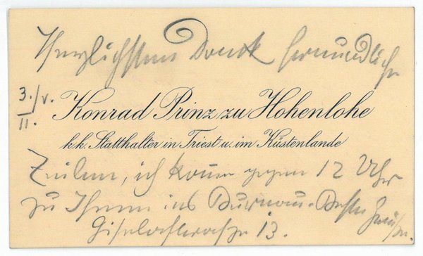1 S. Visitkartenformat. An einen namentlich nicht genannten Adressaten mit Dank für dessen "freundliche Zeilen, ich komme gegen 12 Uhr zu Ihnen ins Bureau". - Der Sohn von Obersthofmeister General Konstantin zu Hohenlohe-Schillingsfürst war von 1904 bis 1915 Statthalter von Triest und der Küstenlande und "förderte die wirtschaftliche Entwicklung und Anbindung der Stadt an das österreichische Hinterland. Nach seinem Rücktritt Präsident des Obersten Rechnungshofs, war H.-S. unter Franz Ferdinand Innenminister und Finanzminister, unter Kaiser Karl Obersthofmeister und zog sich 1918 aus dem öffentlichen Leben zurück. Seine Erinnerungen erschienen 1920" (DBE).