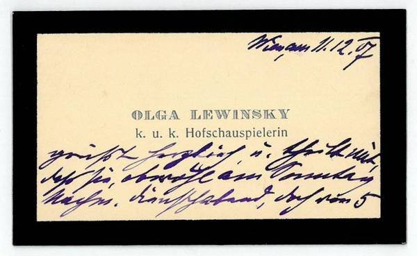 2 SS. Visitkartenformat. [Olga Lewinsky | k. u. k. Hofschauspielerin] grüßt herzlich u. theilt mit, dass sie, obwohl am Sonntag Nachm. diensthabend, doch von 5 an zuhause ist u. sich sehr freuen wird, Sie zu begrüßen, falls es Ihnen möglich u. angenehm wäre […]. - Die Beamtentochter debütierte 1869 am Grazer Stadttheater, lernte bei einem Gastspiel in Klagenfurt Josephine Gallmeyer kennen, mit deren Unterstützung sie nach Wien kam, und debütierte 1871 am Burgtheater. 1873-76 stand sie am Deutschen Landestheater in Prag auf der Bühne und spielte seit 1879 in Kassel, seit 1884 in Leipzig, wo sie als Heroine engagiert war. 1889 kehrte Lewinsky an das Wiener Burgtheater zurück. Seit 1909 war sie auch Lektorin für Vortragskunst an der Univ. Wien. - Auf gedr. Visitenkarte mit Trauerrand.