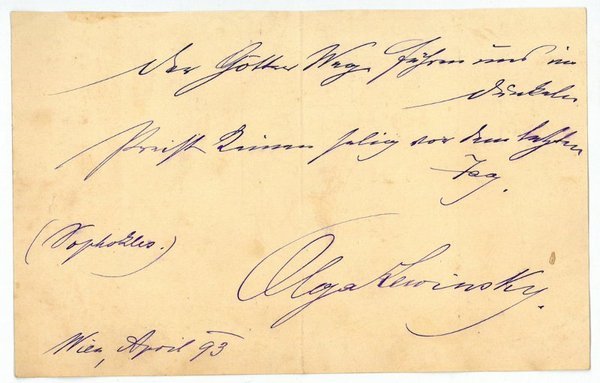 1 S. Qu.-8vo. Der Götter Wege führen uns im Dunkeln. / Preist keinen selig vor dem letzten Tag. (Sophokles). - Die Beamtentochter debütierte 1869 am Grazer Stadttheater, lernte bei einem Gastspiel in Klagenfurt Josephine Gallmeyer kennen, mit deren Unterstützung sie nach Wien kam, und debütierte 1871 am Burgtheater. 1873-76 stand sie am Deutschen Landestheater in Prag auf der Bühne und spielte seit 1879 in Kassel, seit 1884 in Leipzig, wo sie als Heroine engagiert war. 1889 kehrte Lewinsky an das Wiener Burgtheater zurück. Seit 1909 war sie auch Lektorin für Vortragskunst an der Universität Wien.