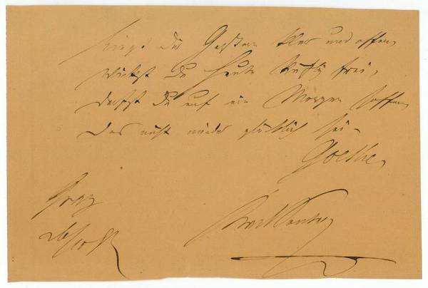 1 S. Qu.-8vo. Liegt das Gestern klar und offen, Wirkst Du heute kräftig frei, darfst auch auf ein Morgen hoffen, Das nicht minder glücklich sei. (Goethe) […]. - Karl Sontag, ein junger Bruder der gefeierten Sopranistin Helene Sontag, debütierte 1848 am Hoftheater in Dresden, kam drei Jahre später an das Hofburgtheater in Wien, spielte später an den Hoftheatern Schwerin, Dresden und Hannover und trat anschließend nur noch gastierend in Deutschland und Amerika auf. 1898 feierte er am Dresdener Residenztheater sein fünfzigjähriges Bühnenjubiläum. Daneben versuchte er sich auch mehrfach und nicht ohne Erfolg als Schriftsteller: Sein Theaterstück "Frauenemanzipation" (Hannover 1875) war auf zahlreichen deutschsprachigen Bühnen zu sehen; ein sehr rückhaltlos urteilendes autobiographisches Werk unter dem Titel "Vom Nachtwächter zum türkischen Kaiser" (1887) war Grund für seine Entlassung aus dem Verband des hannoverschen Hoftheaters.