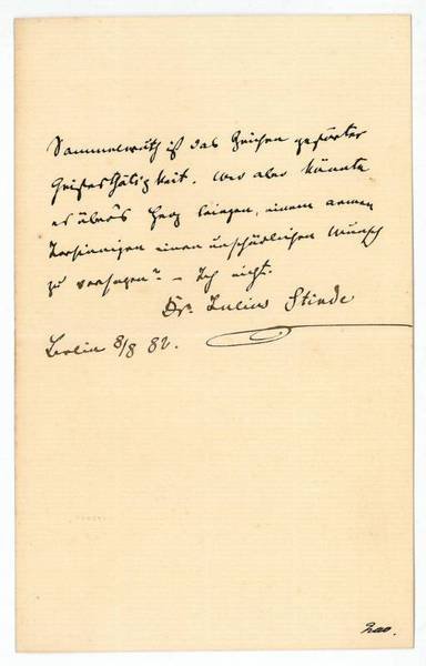 ½ S. auf gefalt. Doppelblatt. 8vo. Sammelwuth ist das Zeichen gestörter Geistesthätigkeit. Wer aber könnte es über's Herz bringen, einem armen Irrsinnigen einen unschädlichen Wunsch zu versagen? - Ich nicht […], - Nach mehrjähriger Tätigkeit als Journalist (u. a. für die "Spenersche Zeitung", die "Wiener Presse" und die "Fliegenden Blätter") verfaßte Stinde zahlreiche, mit großem Erfolg aufgeführte Volksstücke (u. a. "Hamburger Leiden", 1875, oder "Die Familie Carstens", 1877) für das Carl-Schultze-Theater in Hamburg. Seit 1876 als freier Schriftsteller in Berlin lebend, veröffentlichte er unter dem Pseudonym Wilhelmine Buchholz humorvoll-satirische Schilderungen aus dem bürgerlichen Berliner Alltag.
