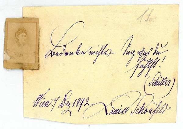 Ca. 112:85 mm. Bedenke nichts - Sag was du fühlst! (Schiller). - Die Tochter des Schauspielerehepaars Karl Neumann und Amalie Haizinger erhielt Schauspielunterricht bei ihrer Mutter und spielte seit 1835 am Hoftheater in Karlsruhe. Nach einem Gastspiel am Hofburgtheater in Wien 1838 wurde sie dorthin verpflichtet und war seit 1840 Hofschauspielerin. Seit ihrer Heirat 1856 trat sie nicht mehr auf, lebte in Graz, seit 1869 vorwiegend in Wien und Kremsmünster. - Mit einerm kleinen Portraitdruck am linken Rande montiert. Alte Montagespuren auf der Verso-Seite.